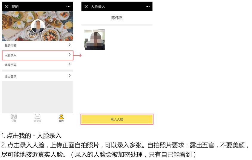 报餐日历、每日菜谱;饭菜讨论组、微饭卡充值;余额查询、就餐记录。